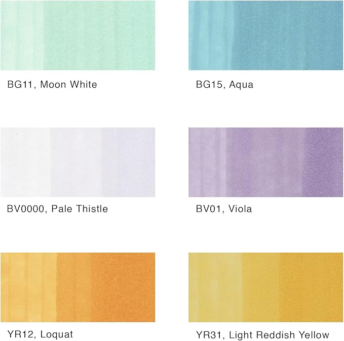 - This 6 piece set includes pale pastel colors BG11, BG15, BV0000, BV01, YR12 and YR31. Great for crafters and springtime illustrations.