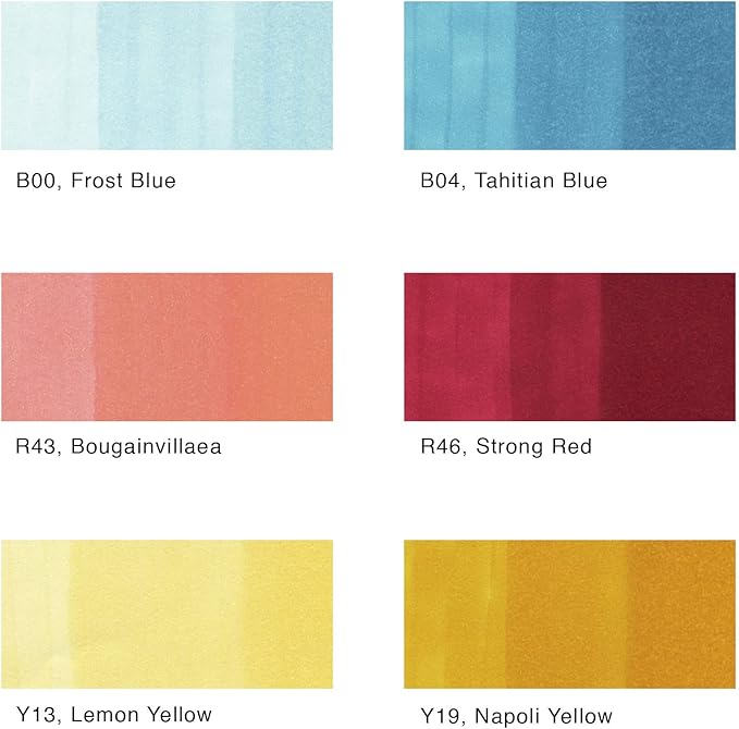 - This 6 piece set focuses on lighter-tone primary colors: R43, R46, Y13, Y19, B00, and B04. Great companion to the Bold Primaries set and is a must for your Copic marker collection.