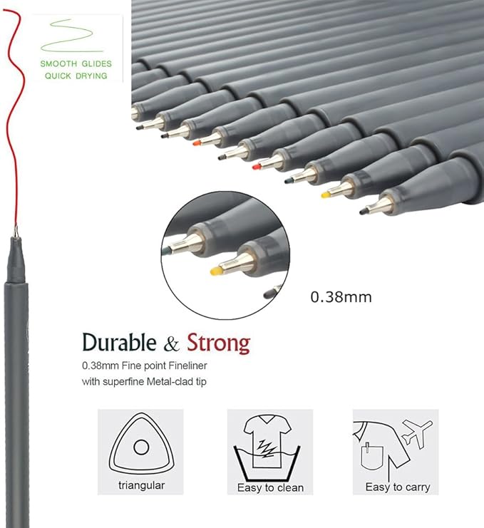 - SMOOTH WRITING: Colorful Fine tip marker pen set with superfine, metal-clad fine tipped and outstanding performance in all areas of writing, drawing, coloring, easy and comfortable to write. Our products are comfortable to use. Especially used by the designers of Architecutre and Animation for drawing lines and signing. Perfect for Journal Pens, Planner Pens, Journaling Pens, Student Pens, School Supplies, Art Supplies, Office Supplies.
