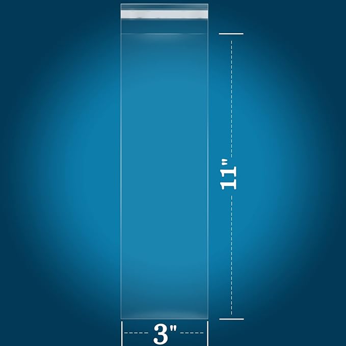 - [SPECIFICATION]: 200 PCS - 3" x 11"(Excludes Glue Flap) Resealable Cellophane Style Bags - Self Sealing. 1.4 Mil Thickness.