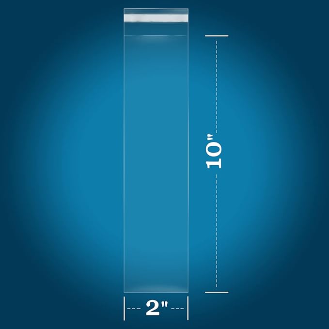 - SPECIFICATION: 200 PCS - 2" x 10"(Excludes Glue Flap) Clear Resealable Cellophane Style Bags - Self Sealing. 1.4 Mil Thickness.
