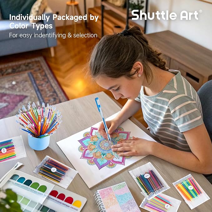 - 140 UNIQUE COLORS: Shuttle Art Gel Pen Refills Set has 140 unique colors, including 7 color types: glitter, neon glitter, metallic, neon, pastel, swirl, standard. Abundant colors with varied color types, fully meet your demands of coloring, writing and drawing.