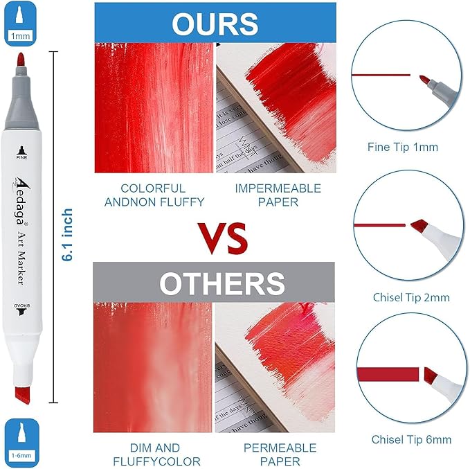 - Quick Drying and Durable: Our alcohol-based markers use alcohol as the solvent, which dries quickly. The Chisel tip of the dual marker is 6mm and the fine tip is 1mm.The drawing markers tip material is strong and durable.These alcohol markers for coloring have good ink that is colorful, non-fluffy, and can be used on non-permeable paper