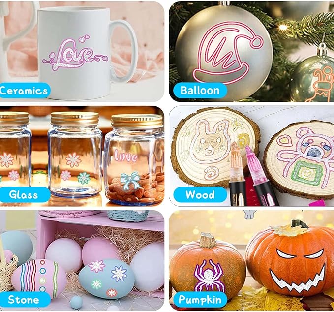 - Widely use: outline metallic markers are perfect for creating artwork, Drawing, Doodling, Card Making, Christmas Greeting Card, and suitable for most smooth surfaces like Wood, Canvas, Ceramics, Metal, Stone, and Glass; or using metallic outline markers painting on porous surfaces like poster paper, rocks, gift cards, canvas, and more