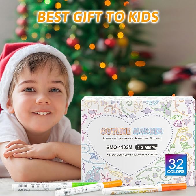 - Unique Double Line Outline Markers & Shimmer Markers:With 2mm medium tip, the self-outline markers have unique dual-color effect design, metallic contou and surrounded by a colored border, create beautiful two-color effects, this glitter markers pen is perfect choice for kid drawing, designing greeting cards and DIY crafts.