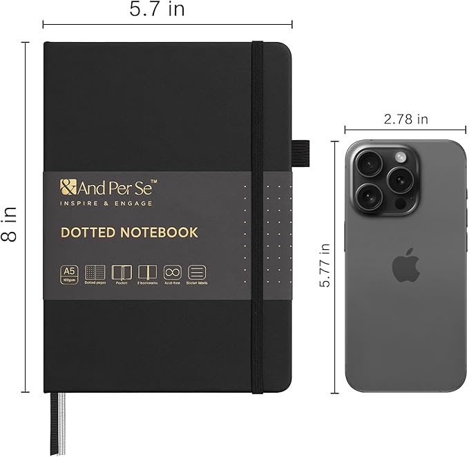 &And Per Se Dotted Journal Notebook, A5 Hardcover Leather Bullet Dotted Journal, 160 Pages 100 gsm Thick Dotted Paper,3 Sheets of Stickers Included (Black)