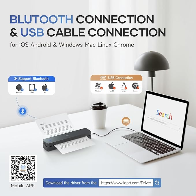 - EASY TO USE: Connects effortlessly to iOS and Android devices via Bluetooth, and to laptops and computers through USB. The "HerePrint" app simplifies smartphone printing, while a driver is needed for computer use(Drivers need to be downloaded from the iDPRT brand website)