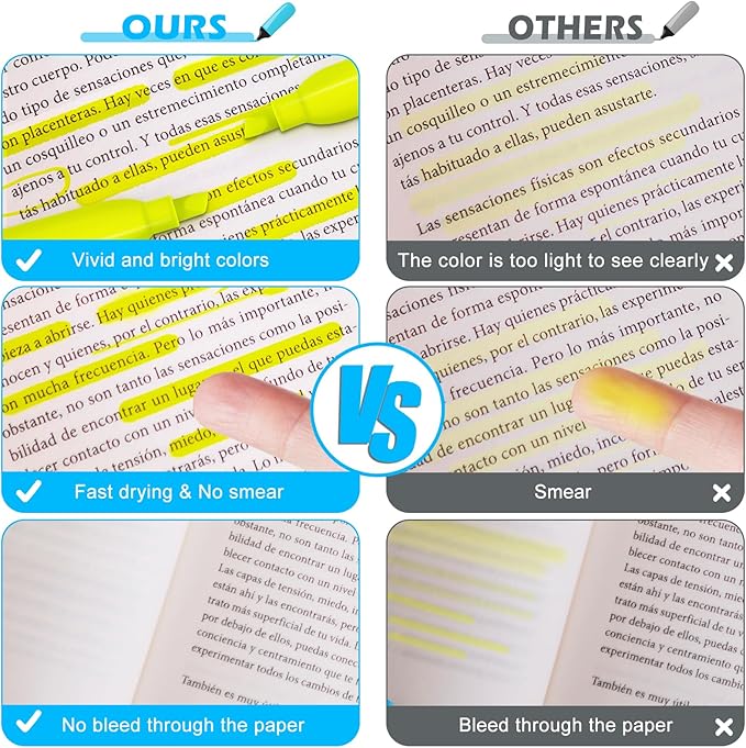 - Non Bleed & Quick-Drying Highlighter - Highlighter pens use quick-drying ink, making highlighted marks clearly visible without worrying about the ink staining your hands and your book. Even if you highlight on one side of the page, the other side is still completely readable, and there's no need to worry about ink bleeding through and affecting the readability of the page.