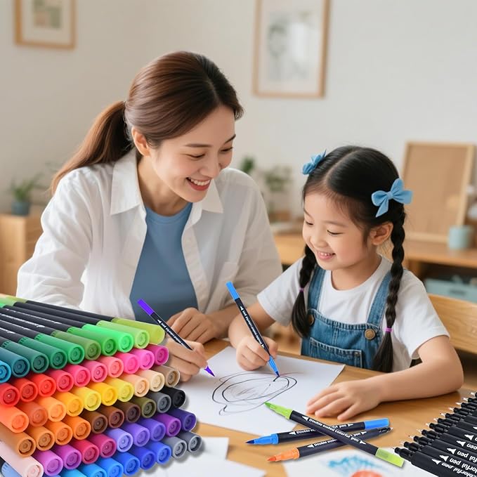 24 Colored Dual Tip Markers Fine & Brush Pens - No Bleeding, Coloring Markers for Adult, Sketching, Drawing, Journaling Art Marker Set